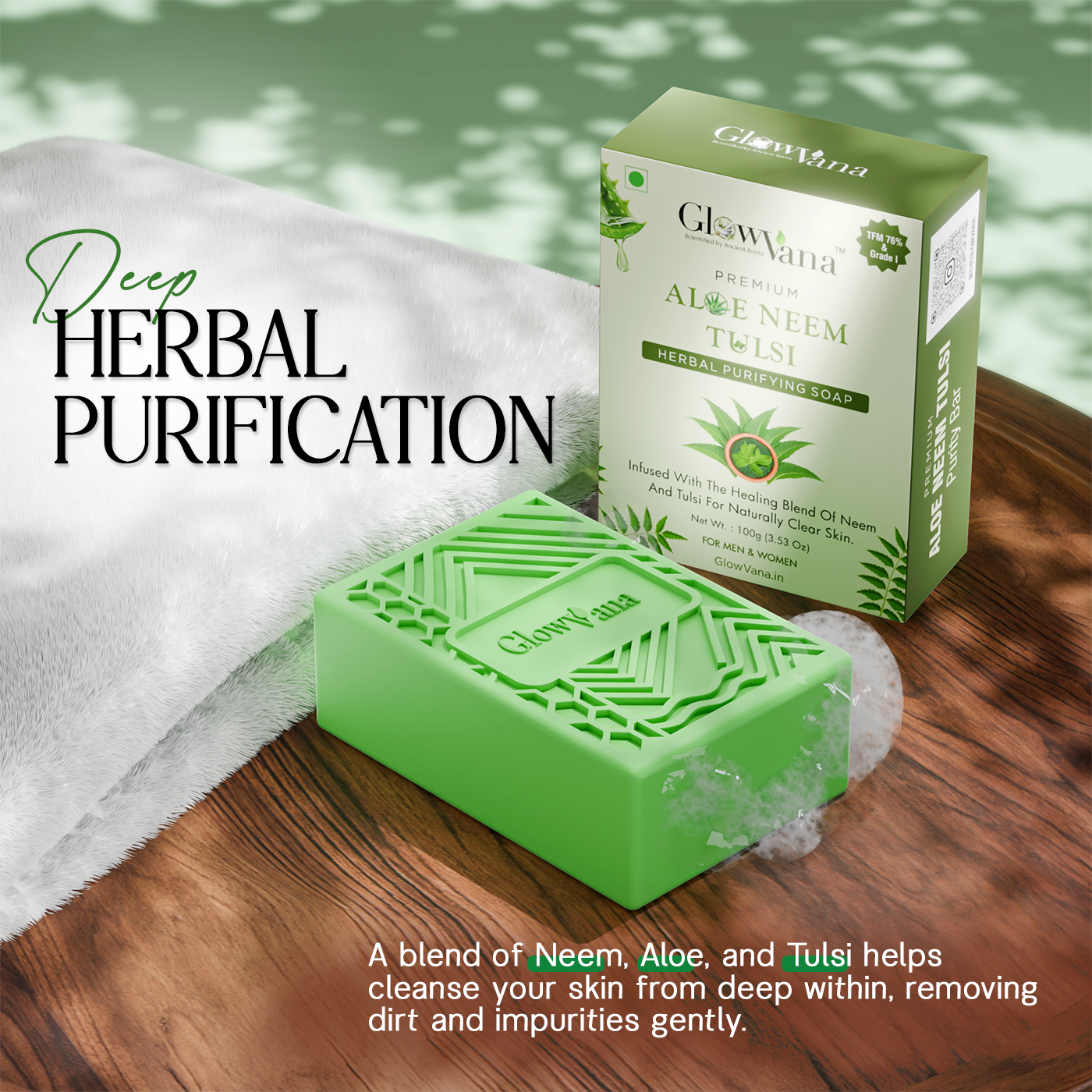 Give your skin the care it deserves with the GlowVana Aloe Neem Tulsi Purity Bar – Pack of 10. Each bar is crafted with the perfect blend of Aloe Vera, Neem, and Tulsi – nature’s finest skin healers. This herbal fusion deeply cleanses impurities, controls acne, and soothes irritated skin while locking in essential moisture.