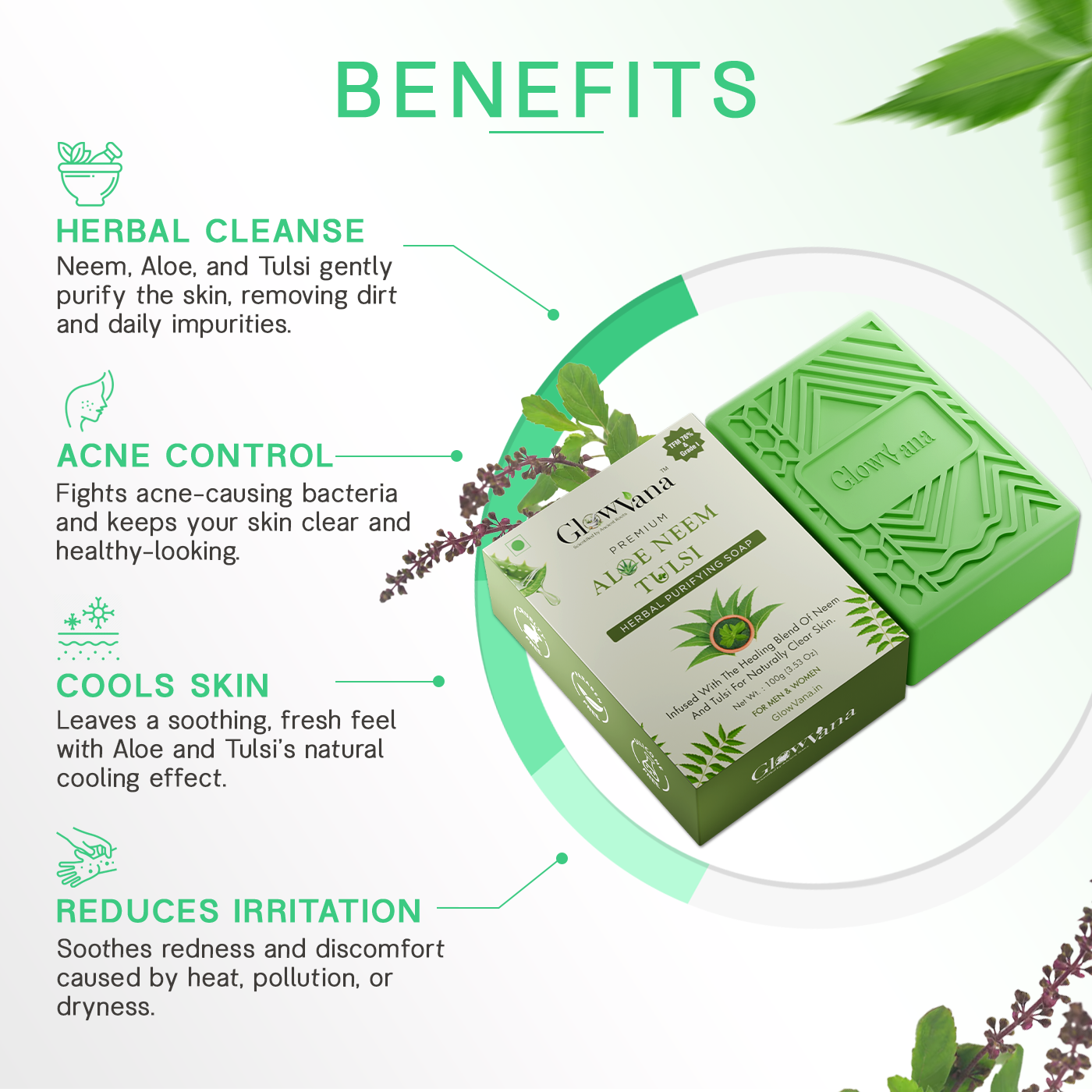 Neem’s antibacterial properties keep your skin protected against infections and breakouts, Tulsi detoxifies and purifies, and Aloe Vera hydrates, calms, and softens the skin. The gentle herbal aroma refreshes the senses, making every bath a revitalizing experience.