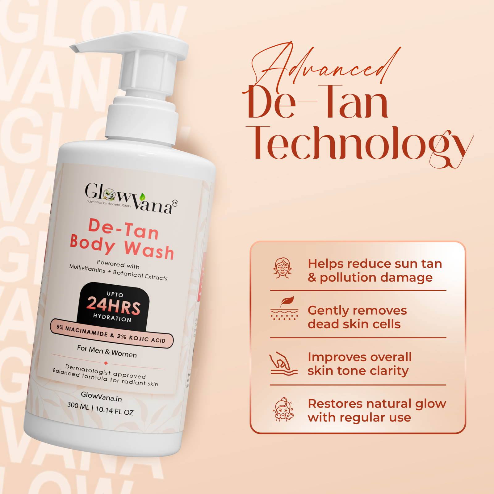 GlowVana De-Tan Body Wash is a premium skin-brightening body cleanser specially formulated to remove tan, dullness, and dead skin cells caused by sun exposure, pollution, and daily stress. Enriched with powerful natural extracts and skin-loving actives, it gently cleanses while restoring your skin’s natural glow.